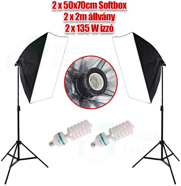 A softbox szett használható fotó illetve videóstúdióban is. A készlethez tartozó két darab 50 x 70 cm-es softbox segítségével lágy 5500 kelvines fényt hozhatunk létre, amely legjobban hasonlít a nappali fényviszonyokhoz. Ezen készlet alkalmas portréfotózáshoz, tárgyfotózáshoz és termékfotósához is egyaránt. A maximális magassága a softbox tartóállványnak 200 cm. Energiatakarékos állandófényű izzóval ami csak 135W-ot fogyaszt, de a fényereje 650W felel meg, ebből kettő található a softbox szettben. Az árérték arányban is olcsó de kellően erős fényerővel rendelkező softbox.